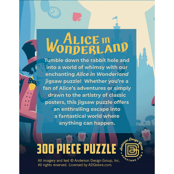 Tumble down the rabbit hole and into a world of whimsy with our enchanting Alice in Wonderland jigsaw puzzle! This delightful 300-piece puzzle brings together the charm of nostalgic poster art and the magic of Lewis Carroll's timeless tale. Dive into Wonderland with stunning poster art that captures the imagination and whisks you back to a bygone era. Each piece is a fragment of vintage brilliance, bringing to life iconic characters like the Cheshire Cat, Mad Hatter, and of course, Alice herself! Whether you're a fan of Alice's adventures or simply drawn to the artistry of classic posters, this jigsaw puzzle offers an enthralling escape into a fantastical world where anything can happen.