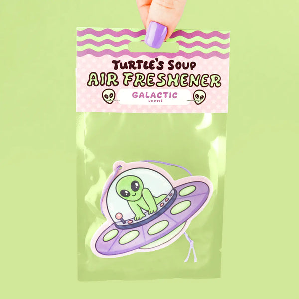 Mooning Alien' Air Freshener by Turtle's Soup. SCENT: Galactic “Floral & fruit fragrance that’s out of this world” ✨ Includes one (1) scented, double-sided, air freshener ✨ Air freshener comes in a smell-proof pouch. Once opened, the scent lasts for several weeks. Caution statement: This product is not a toy. Keep away from children and pets. Do not consume. Hang freely to avoid staining nearby surfaces. Do not hang in a way that obstructs the driver’s view