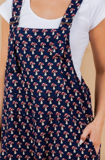 Be one with nature in our Mushroom Print Overalls. Made from soft corduroy fabric with a playful small mushroom print, these overalls are perfect for exploring the great outdoors. With an adjustable hem and pocket, you'll have everything you need for your next adventure. (Fungi pun intended!)
