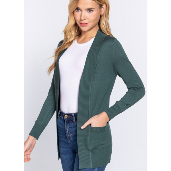 Soft and stretch mid-length open front cardigan with pockets. Perfect layering piece for any season!