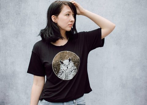 This boxy relaxed fit crop tee is made from super soft, semi sheer modal fine jersey. Pairs well with decorative bralettes and camisoles, high waisted pants or low rise for a midriff baring look. Great for layering or worn alone. Features our original shimmering owl design printed in water based non-toxic white and shimmering gold glitter ink at our Harrisburg, PA studio.