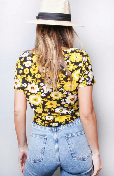 Flower power meets crop top chic in our Short Sleeve Asymmetrical Neck Floral Print Crop Top. With a flattering scoop neck and playful short sleeves, this top is the perfect addition to any summer wardrobe. Embrace your playful side with this retro inspired printed top.