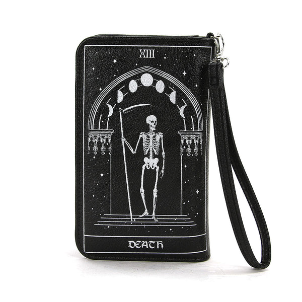 Tarot card wallet with zipper and wrist strap and The Moon design on one size and Death design on other.