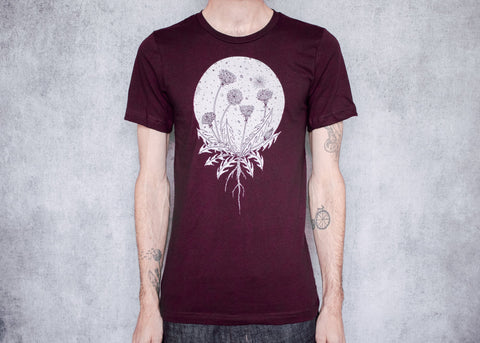 This gorgeous plum tee made its debut in our mystery box but is now available to everyone. Fennec's original illustration is a playful exploration of the theme of wish making: a detailed dandelion in front of a full moon. Hand drawn before being screen printed in their Harrisburg PA, Studio with white colored non-toxic water based ink.